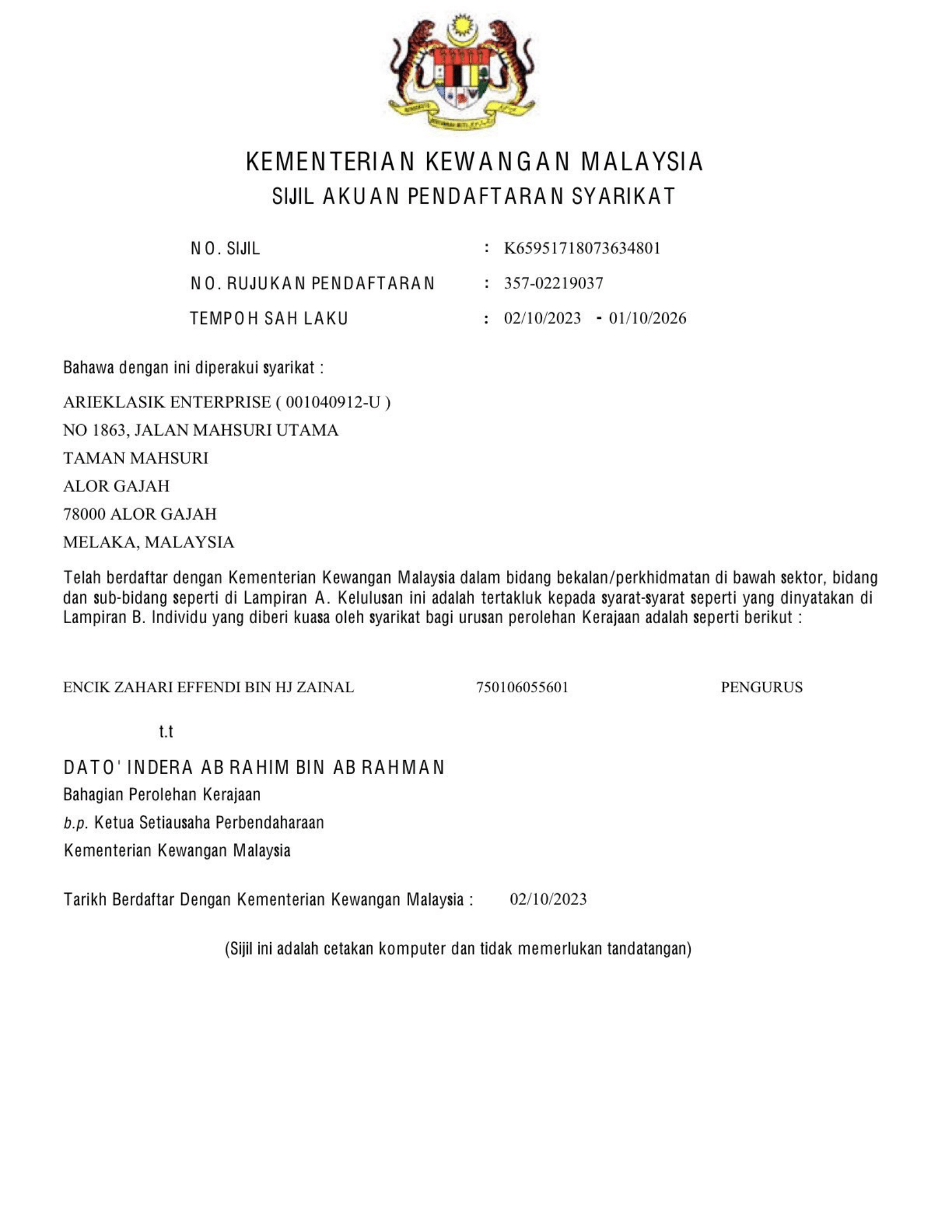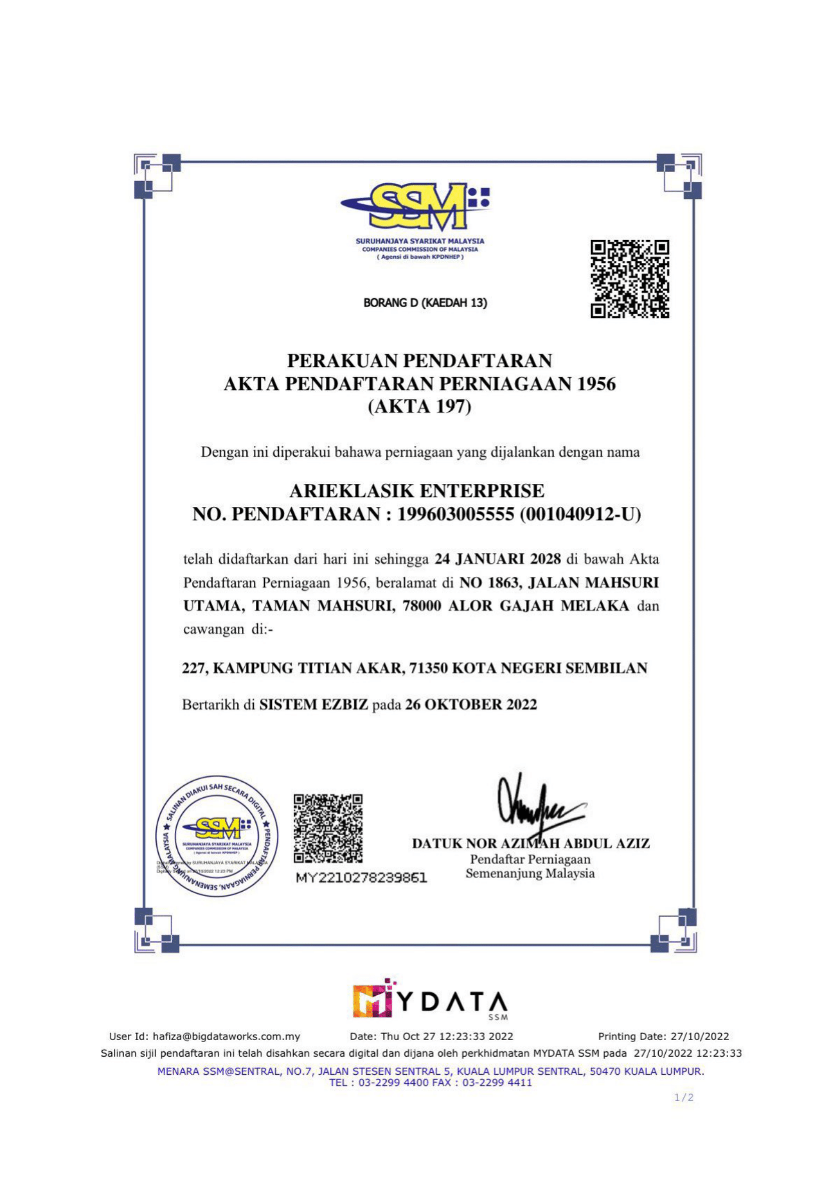 ARIEKLASIK ENTERPRISE syarikat milikan penuh bumiputera yang telah ditubuhkan pada 17 Januari 1996 dan beroperasi di Alor Gajah, Melaka. Syarikat ini telah diasaskan oleh Zahari Effendi Bin Hj Zainal iaitu merupakan Pengarah Urusan Arieklasik Enterprise yang bertanggungjawab ke atas prestasi perniagaan.