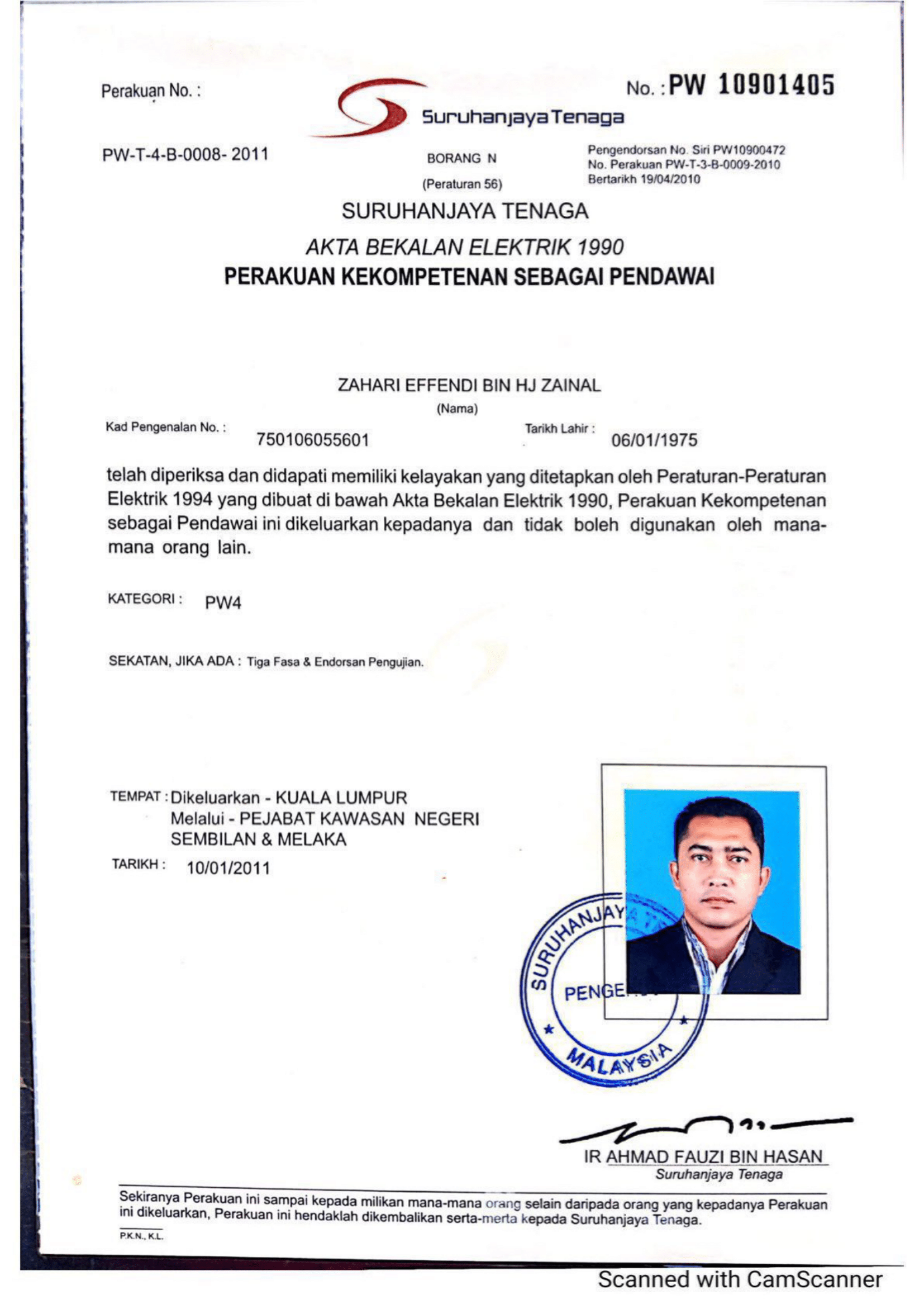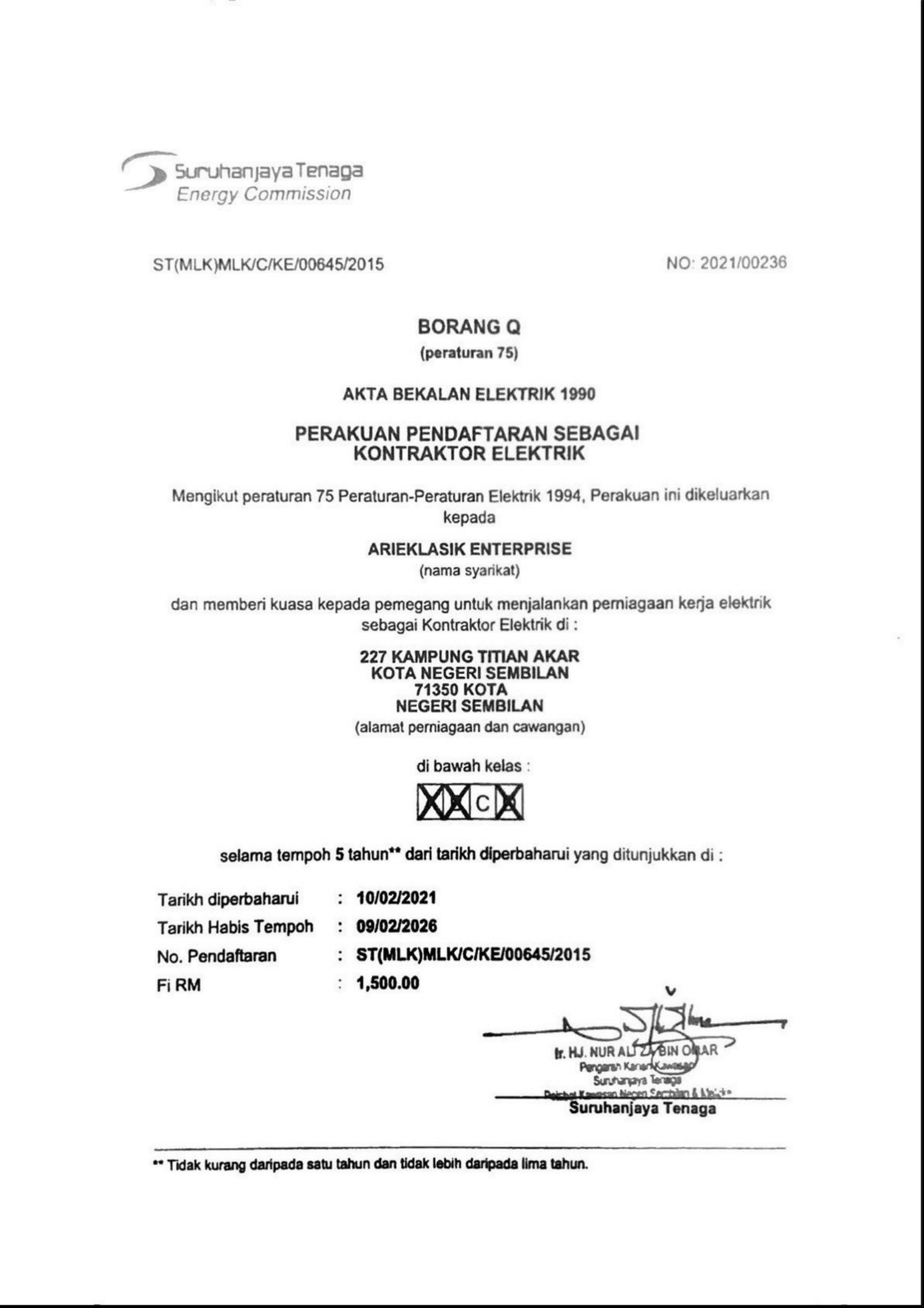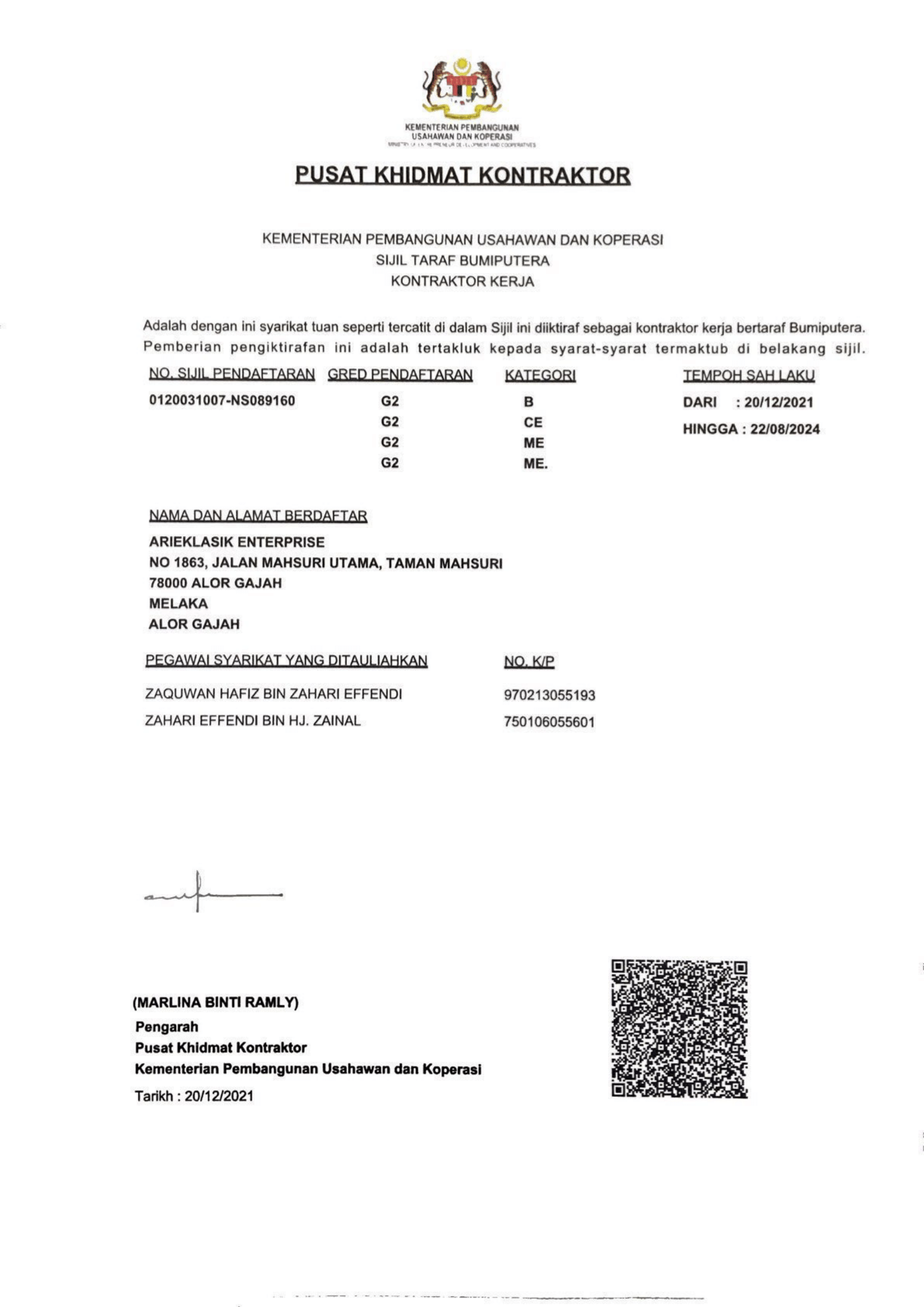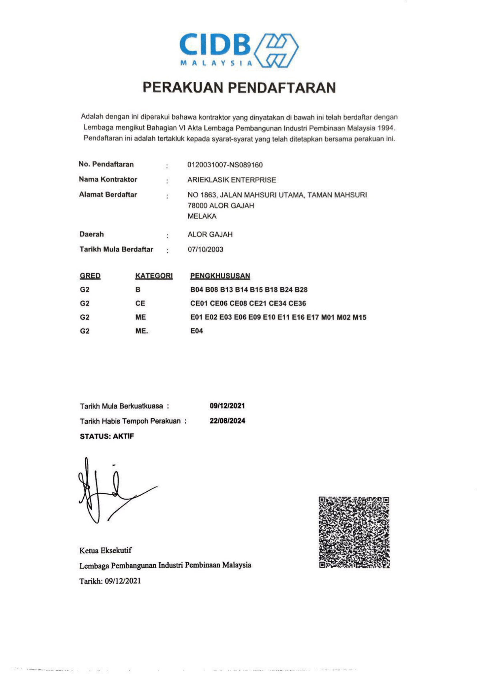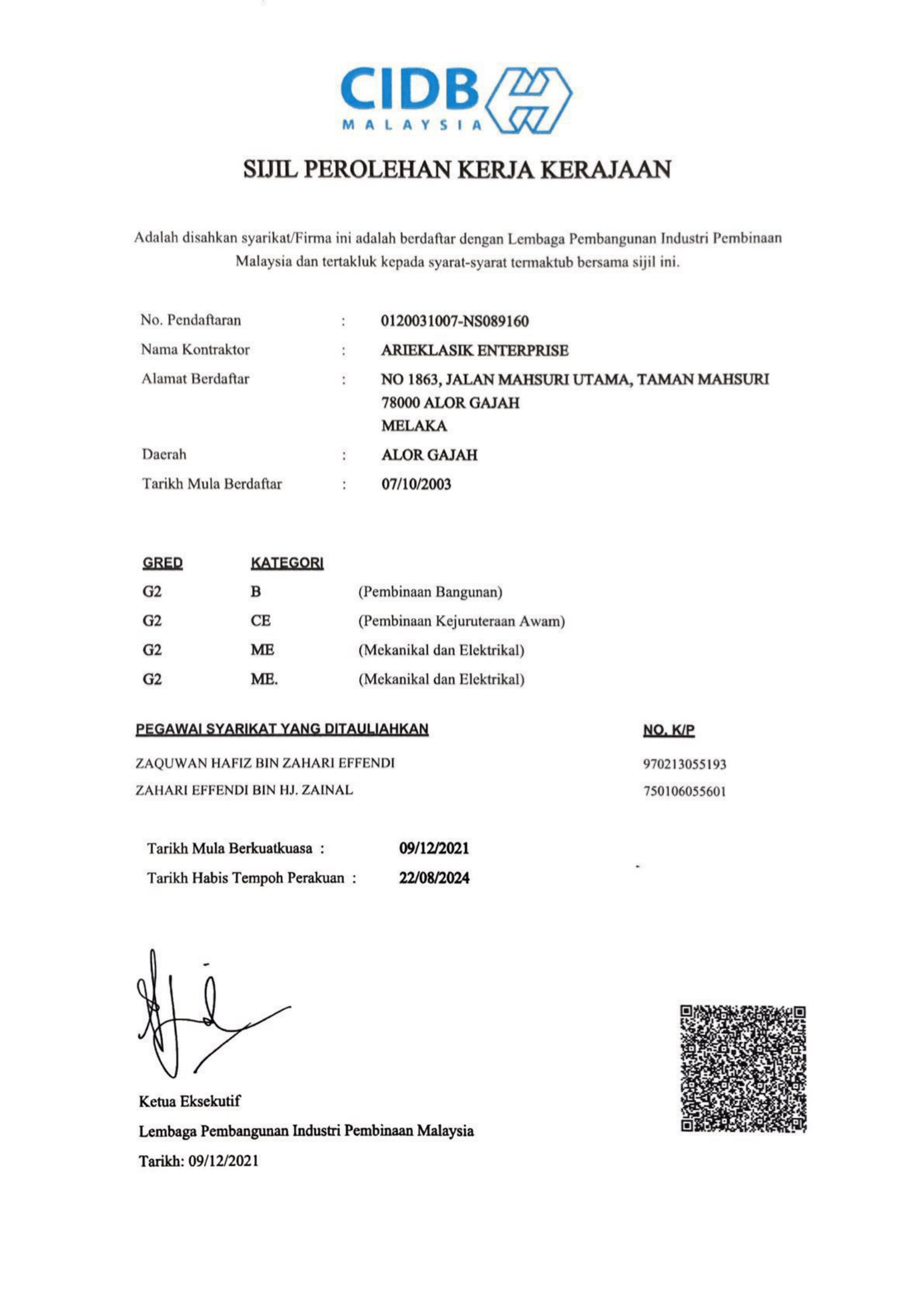 Dalam menepati keperluan dan syarat bagi sebuah syarikat pembinaan yang berkelayakan, pelbagai sijil dan pentauliahan telah kami perolehi seperti pentauliahan lesen KELAS C oleh Suruhanjaya Tenaga bagi kerja-kerja elektrik; serta berdaftar dengan Lembaga Pembangunan Industri Pembinaan Malaysia (CIBD).